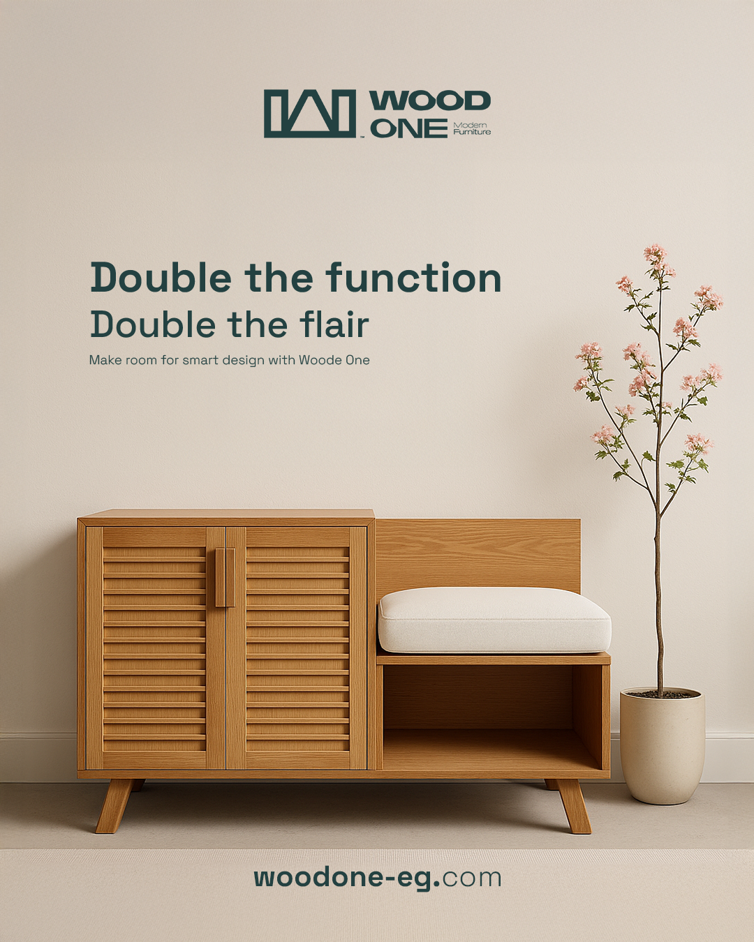 This luxurious shoe cabinet combines practicality and elegance with a sleek oak veneer finish and upholstered fabric details for a sophisticated look. Designed by Naguib Selim, it offers premium craftsmanship and innovative features.